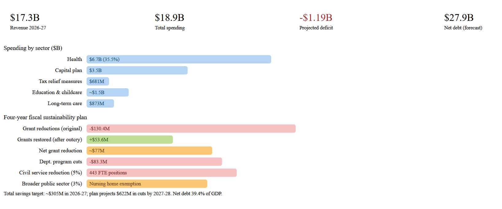With revenues of $17.3 billion and expenses of $18.9 billion, the budget estimates a deficit of $1.19 billion before contingency. Total cuts amount to roughly $304.9M, comprising $130M in grant reductions to external organisations, $83.3M in departmental program cuts, and a 5% civil service reduction affecting 443 positions, alongside a 3% cut to the broader public sector including Crown corporations